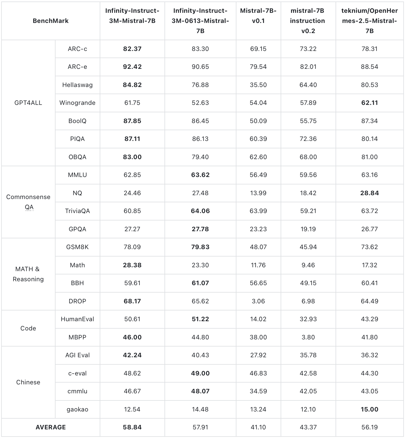 π₯π₯π₯[2024/06/13] We share the intermediate result of our data construction process (corresponding to the InfInstruct-3M in the table below). Our ongoing efforts focus on risk assessment and data generation. The finalized version with 10 million instructions is scheduled for release in late June.