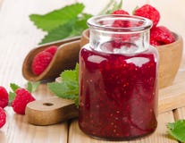 A glass jar filled with a rich red jam is placed on a wooden surface. The jar is surrounded by fresh raspberries, some of which are scattered around the jar, while others are neatly arranged in a wooden bowl. A wooden spoon rests beside the jar, and a few green leaves are visible in the background.