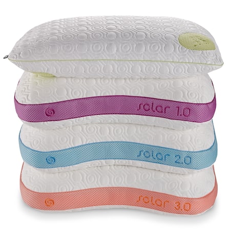 A stack of four solar-powered pillows with a textured surface and a solar panel on the bottom. The pillows have a blue, white, pink, and orange color scheme, with the blue one on top and the orange one on the bottom. Each pillow has a small logo on the bottom right corner.