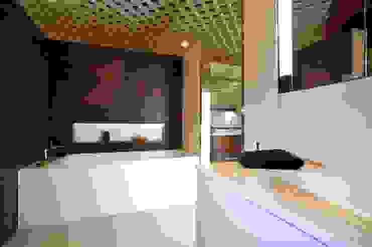 A pixelated image of a bathroom with a shower area on the left, a toilet in the center, and a sink on the right. The shower curtain is partially open, revealing a wooden beam and a green patterned wall. The floor is tiled, and there is a black object on the floor near the sink.