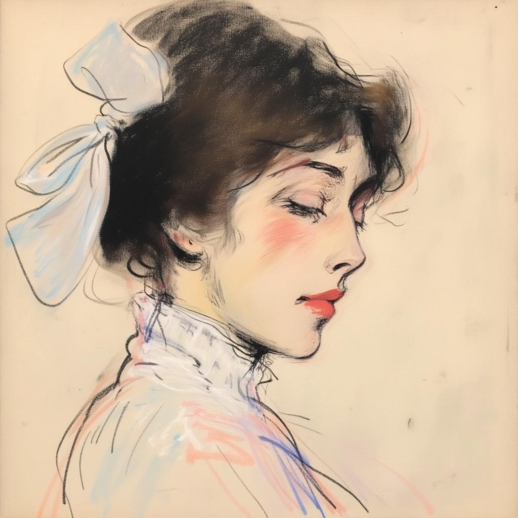 - a woman with a bow on her head. She has a gentle expression on her face and her eyes are looking off to the side. in the style of TOK