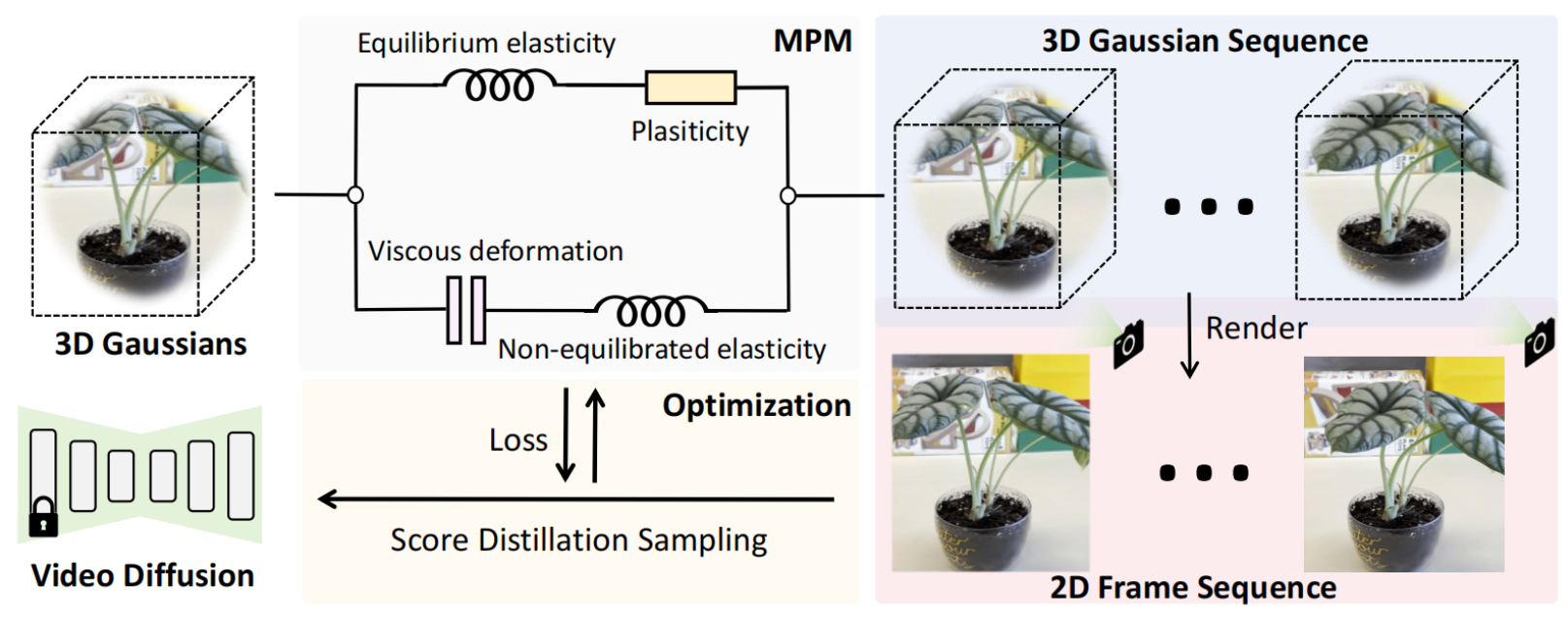 Physics3D uses a video diffusion model to learn and simulate the physical properties of 3D objects, enabling realistic behavior prediction in virtual environments.
