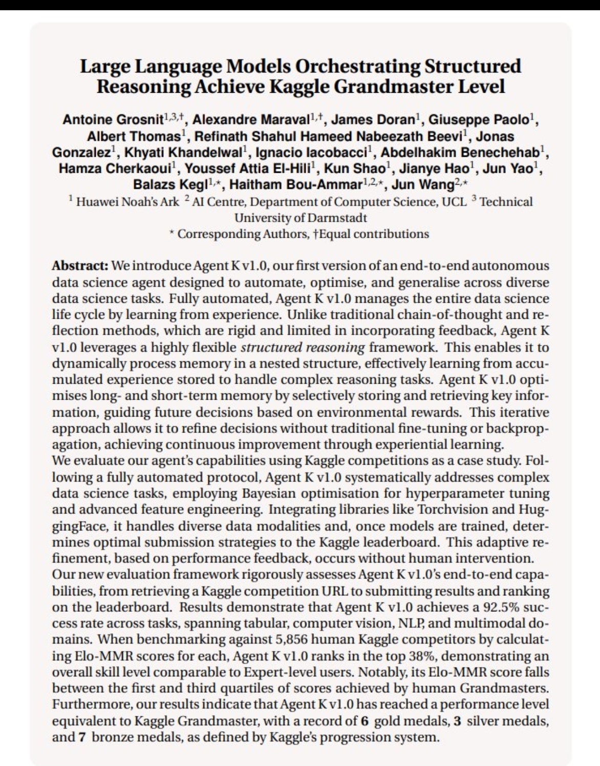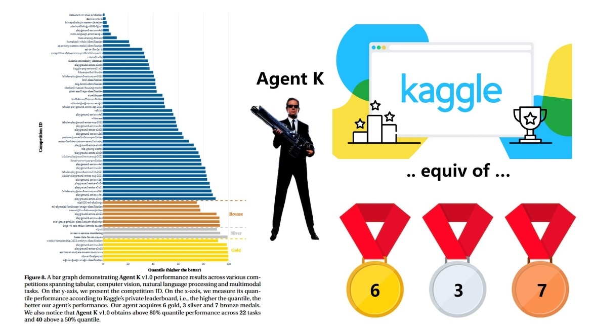 Agent K is the first end-to-end agent (i.e., autonomous from Kaggle URL to submissions that win competitions) to achieve an equivalent of Kaggle grandmaster level. Our agent codes the whole data science pipeline from a natural language description of the competition and raw data!