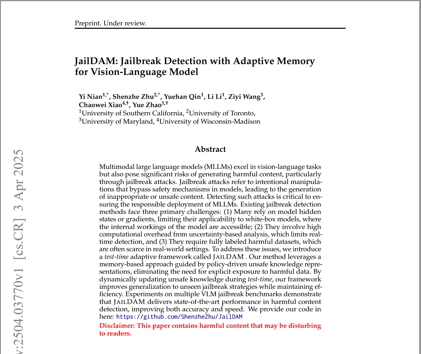 - TAIJI: Textual Anchoring for Immunizing Jailbreak Images in Vision Language Models (2025)