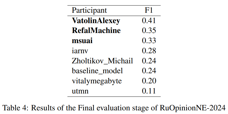 ๐ข Delighted to share evaluation of the most recent LLM systems on explainable opinion mining from mass-media texts. In a form of RuOpinionNE-2024 competition we consider an extraction of opinion tuples (subject, object, sentiment expression / span) from mass-media texts written in Russian. This paper represent summary of the passed competitions in a form of extensive experiment of applying various set of LLMs in zero-shot / few-shot / fine-tuning (submissions) modes.