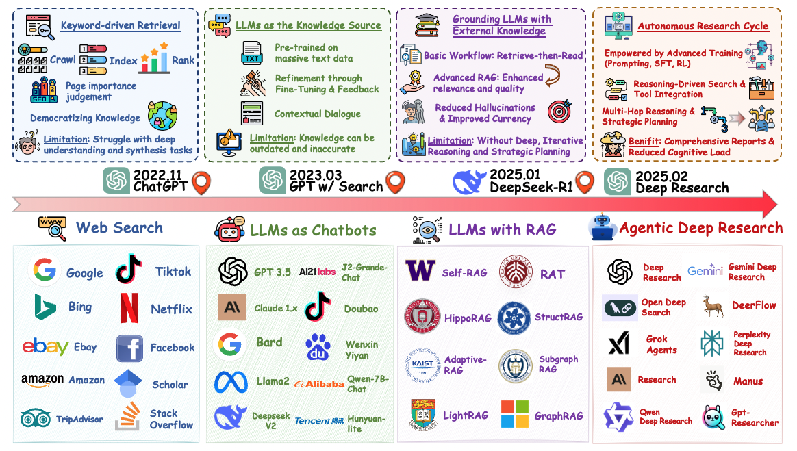 π€ As a more agent-focused extension, we highlight the paradigm shift in information searchβfrom traditional web search to Agentic Deep Research, where autonomous agents iteratively search, reason, and synthesize information to tackle complex tasks.