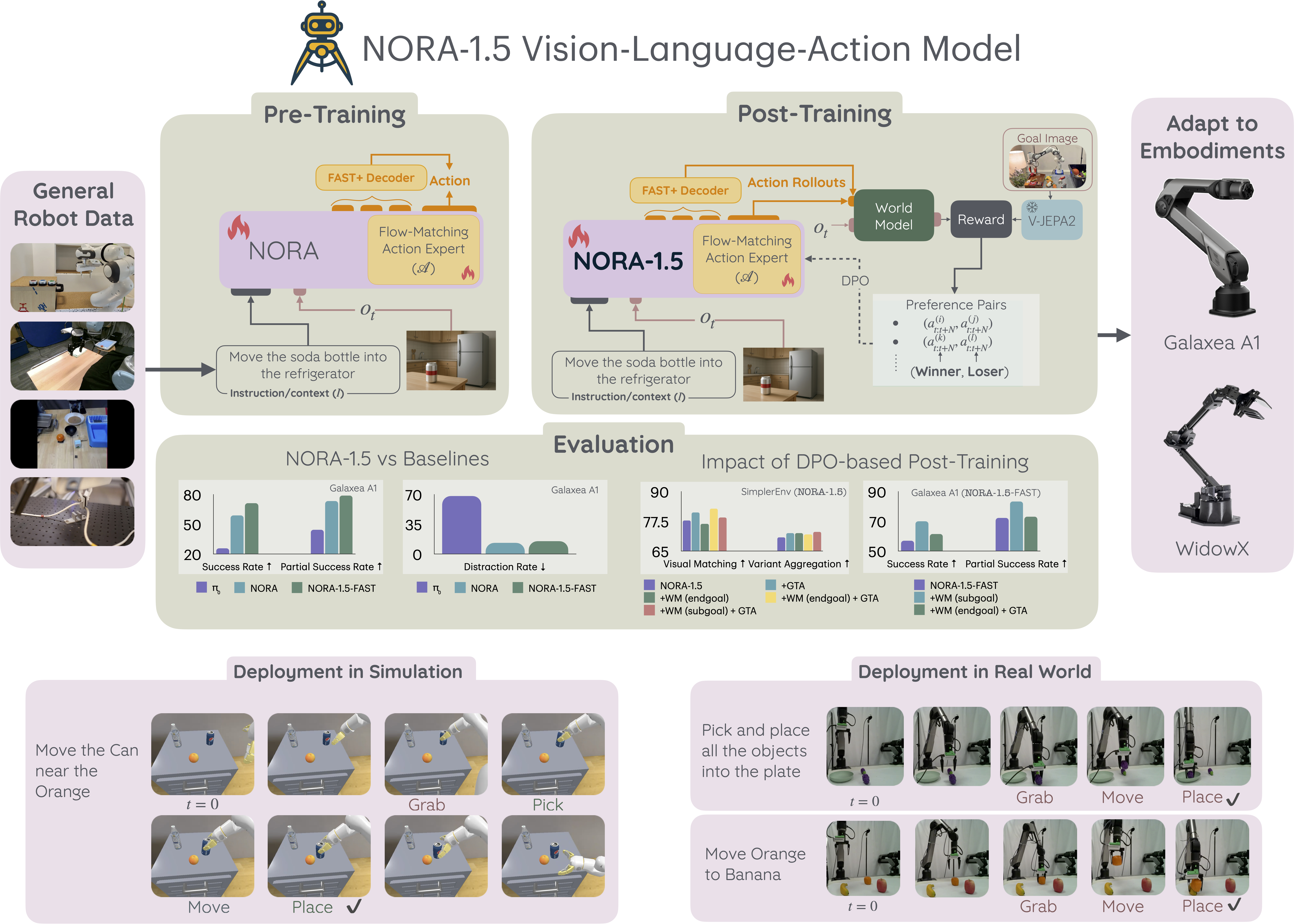 NORA-1.5, an enhanced vision-language-action model with a flow-matching-based action expert and reward-driven post-training, improves performance and reliability in both simulated and real-world settings.