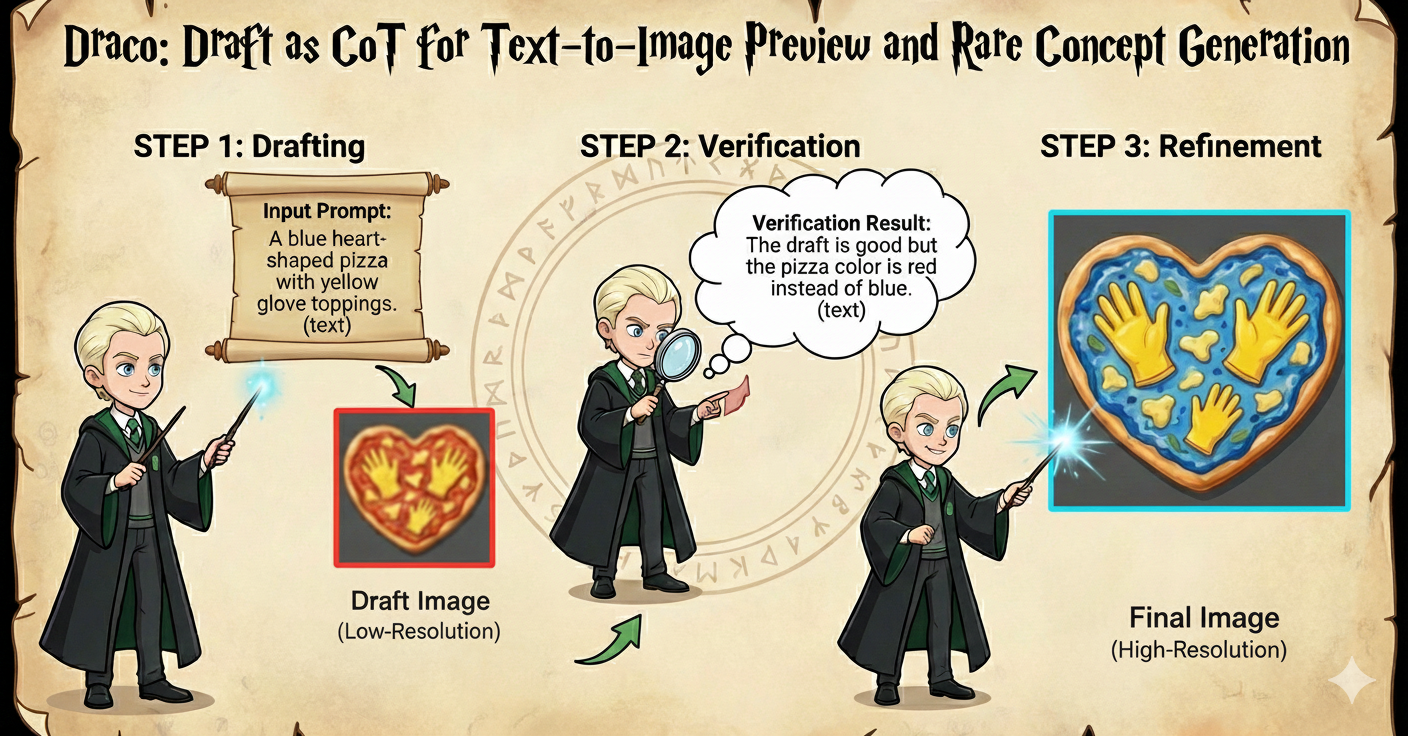 DraCo, a novel interleaved reasoning paradigm, enhances text-to-image generation by integrating both textual and visual content, generating low-resolution drafts, verifying semantic alignment, and refining images with super-resolution to address challenges in textual planning and rare attribute generation.